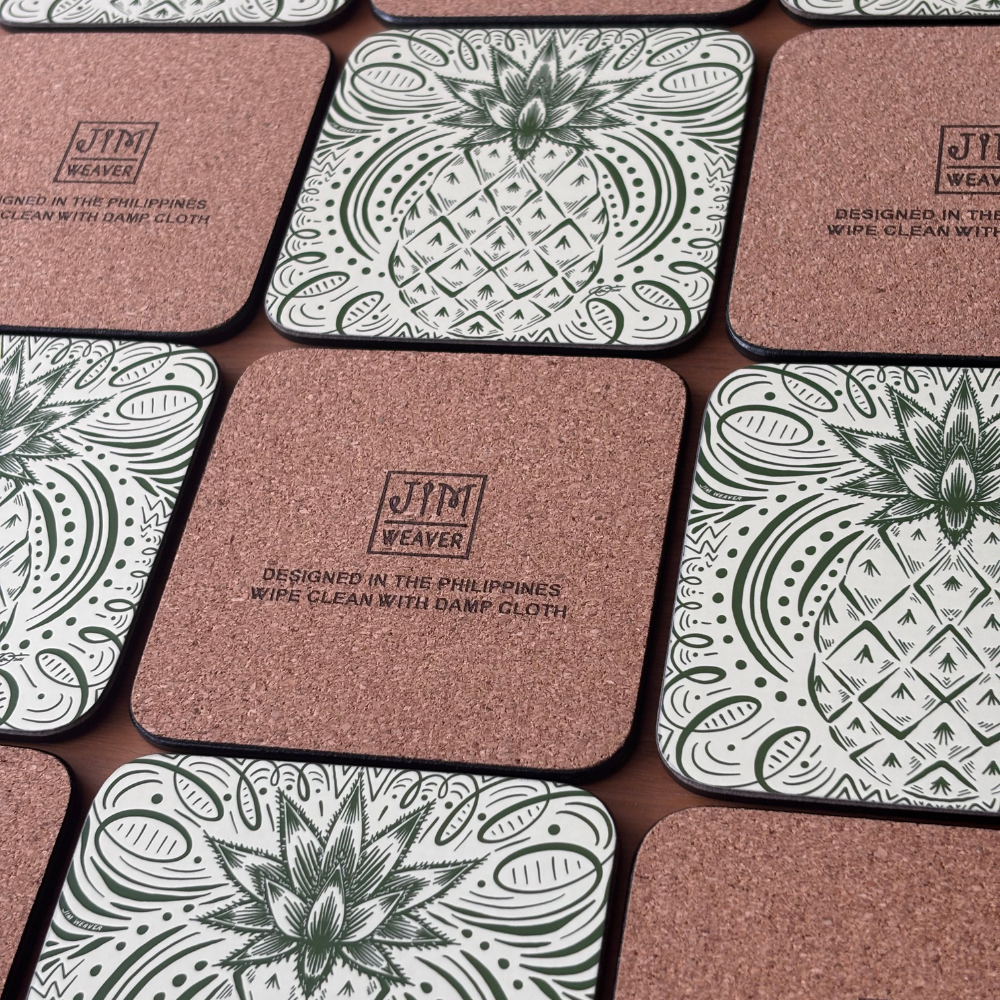 Our placemats and coasters are structured in 4 layers – a lacquer finish on top, the original art print, a 5mm board and a cork backing at the bottom. They are heat resistant for up to 100 degrees celsius, as well as stain and scuff resistant. They can be easily cleaned by wiping with a damp cloth. Each placemat is 290x400x5mm big. Coasters are 4×4 inches with a 5mm height.